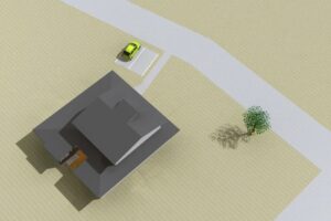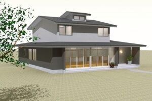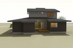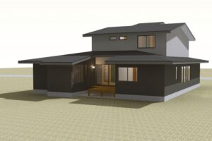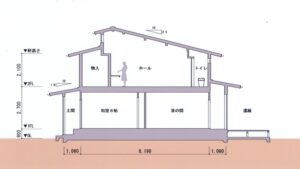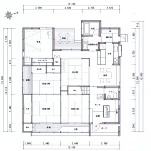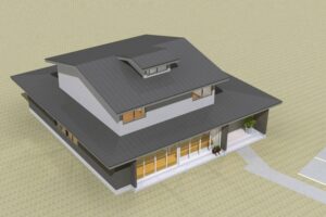 毎月行われる法事のための部屋に茶の間を加えた和室を田の字型に配置し、それを椅子座の諸室がL型に囲んでいる。和室8帖二間と外部との中間にある縁側・土間は窓を掃き出しとすることで、濡縁的な使い方ができる。2階は腰屋根の高窓から採光しているホールを中心に、個室群を配している。
